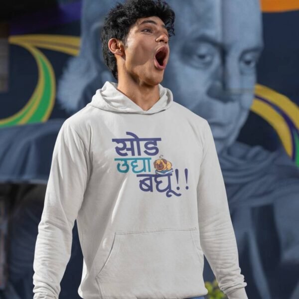 The “Sod Udya Baghu Marathi Quotes Printed Hoodie” is a fun and comfortable hoodie that brings a popular Marathi quote to life. Made with soft, high-quality fabric, this hoodie offers both warmth and style, making it perfect for cooler days or casual outings. Whether you’re strolling through the city or simply relaxing, the playful Marathi phrase “Sod Udya Baghu” adds a touch of humor and cultural pride to your look. Ideal for anyone who loves Marathi sayings or enjoys wearing statement pieces, this hoodie is a must-have for expressing your Marathi identity with flair.